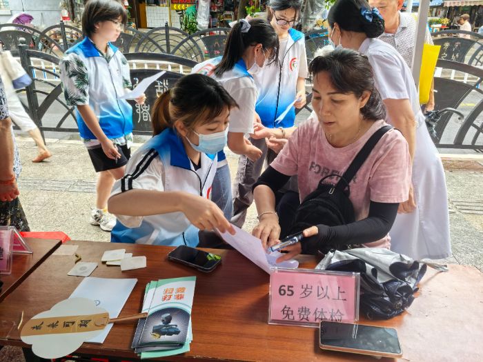 另一部分隊員則手持精心設計的調研問卷,穿梭于人群中。他們采取現場詢問、記錄的方式,收集了居民們對于中醫藥文化的看法與建議。“婆婆,您平時有關注中醫藥嗎?覺得中醫好不好?”一位隊員用粵話親切地問道正在享受艾貼的婆婆。婆婆笑著回答,并分享了自己對中醫藥的看法。這樣的對話,在社區上不斷上演。這種巧妙的安排讓調研工作更加順利,利用這個與居民們近距離接觸的機會收集到關于中醫藥文化的第一手資料。