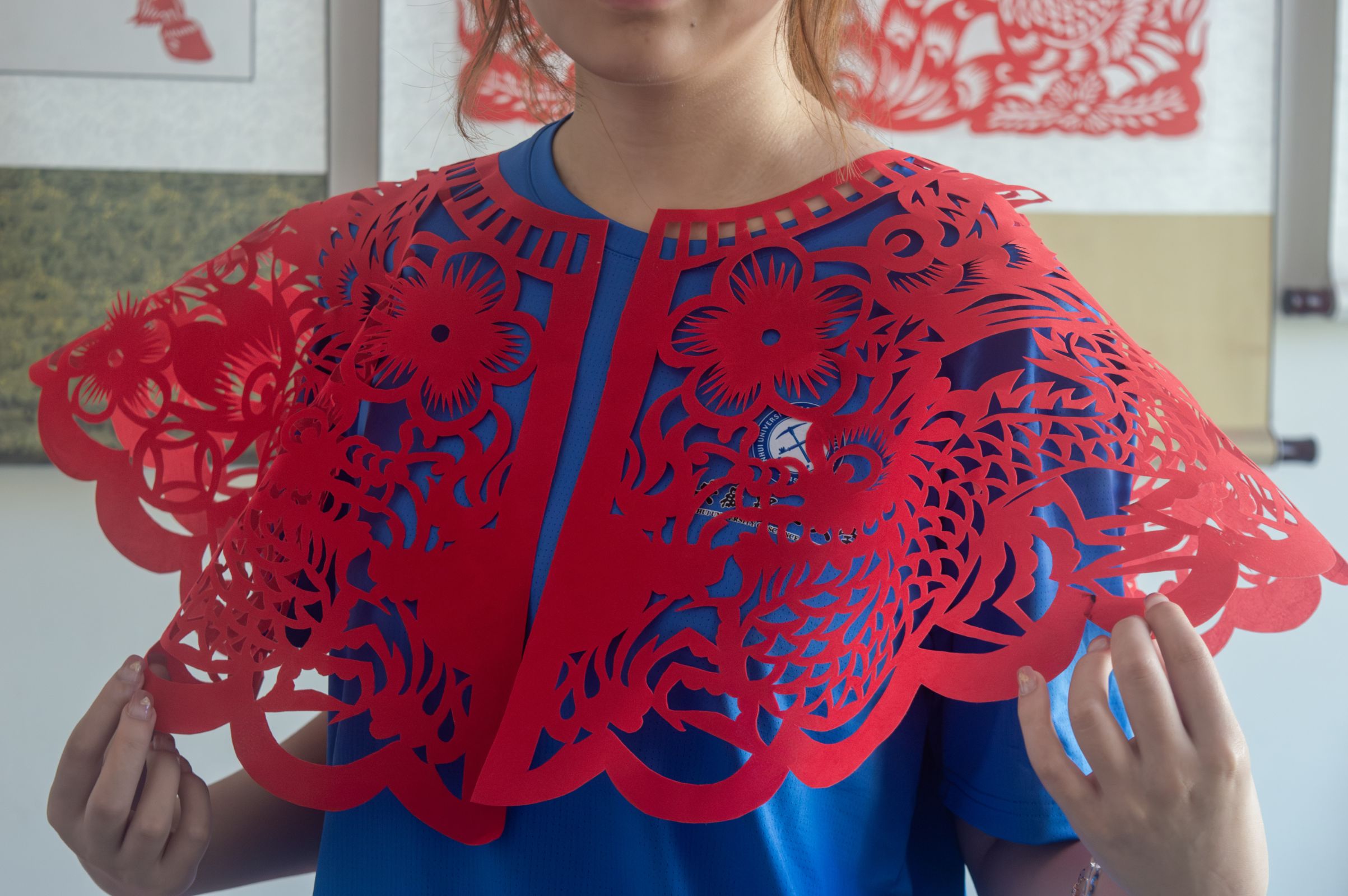 陽光透過樹葉的縫隙灑下,形成一片片跳躍的光斑。實踐團前往磚集鎮劉廣軍剪紙藝術工作室及磚集中學手工教室,在老師的帶領下,團隊成員有幸欣賞到了其他老師的藝術作品,如庫淑蘭老師等。同時實踐團系統性的學習了刻畫與剪紙藝術的技法差異,特別是通過是實物對比,深刻體會到工業剪紙與手工剪紙在鋸齒紋樣處理上的不同。隨后,團隊成員試穿了劉老師精心制作的絨布云肩,傳統服飾與非遺剪紙文化相碰撞,讓界首剪紙“活”當下。之后參觀了手工教室內陳列的學生作品,展廳不大,但每一件展品都經過精心布置,當地政府和部門的積極作為為界首剪紙提供了新活力。
