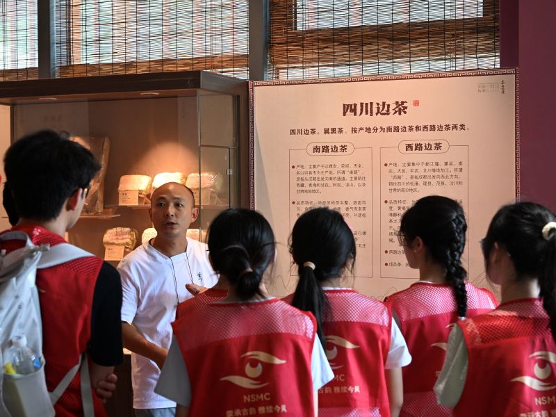 園區負責人介紹,雅安藏茶隸屬南路邊茶,是國家級非物質文化遺產之一。隊員們了解到,藏茶的歷史淵源可追溯至唐朝文成公主進藏時期,漢藏文化交流為其發展埋下伏筆;新添驛站修建于康熙年間,依托驛站的興盛,新添鎮逐漸成名;過去,藏茶依靠背夫肩扛茶磚,翻山越嶺送往各地藏區……小小的園區之內,靜靜傳承著千年的藏茶非遺文化。