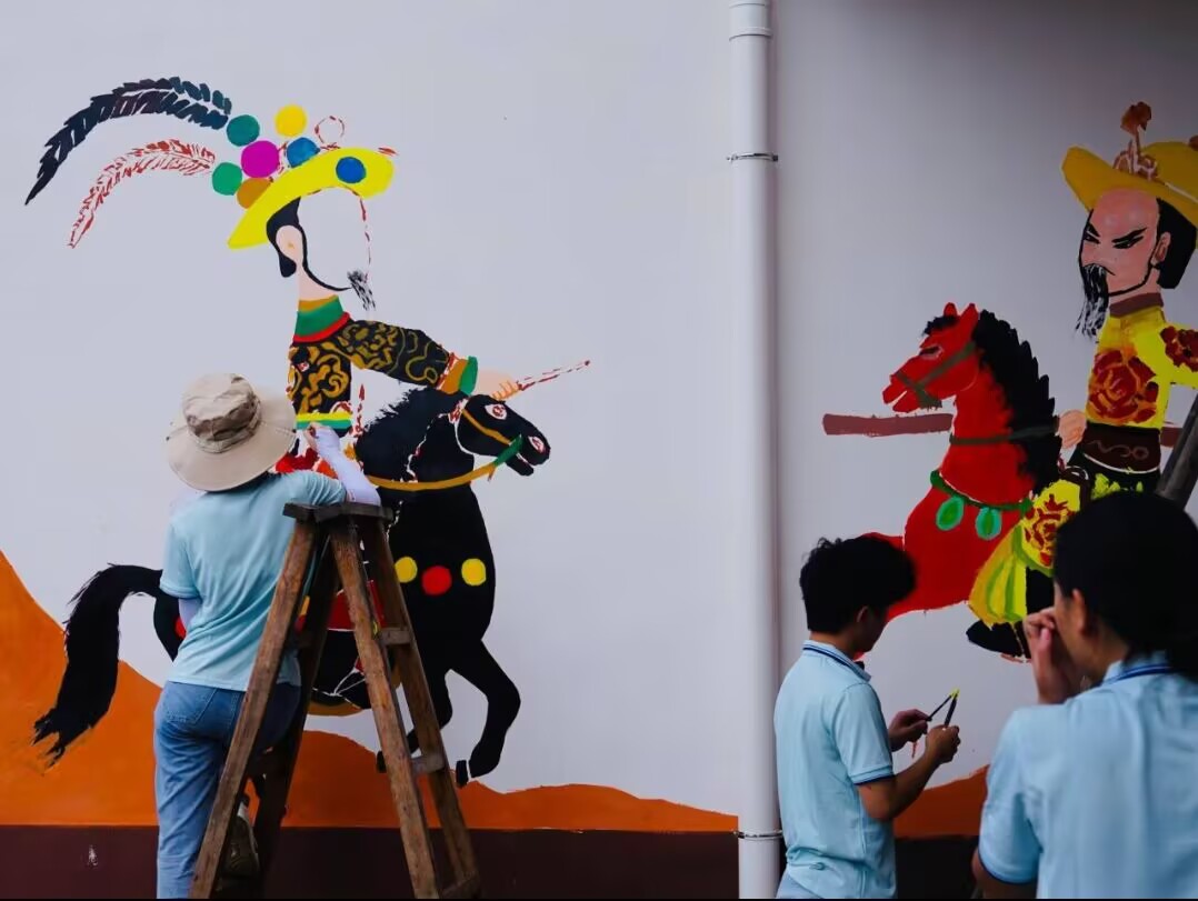 面對(duì)湘潭持續(xù)高溫,團(tuán)隊(duì)采用"早五晚九"的工作制,在晨光中起筆,借路燈收工 ,完成了升平軒紙影博物館外墻主題墻繪:近50℃墻面下,顏料反復(fù)凝結(jié)又重調(diào),汗水滴落化作墻繪中的紋路,主繪小張曬脫皮仍堅(jiān)持徒手創(chuàng)作。為精準(zhǔn)呈現(xiàn)皮影戲特有的夸張表情,他們反復(fù)觀摩演出錄像,甚至跟著傳承人學(xué)習(xí)操縱技巧。"只有親手?jǐn)[弄過(guò)皮影,才知道'吹胡子瞪眼'時(shí)眉毛該翹多高。"團(tuán)隊(duì)成員舉著滿是顏料的調(diào)色盤(pán)說(shuō)道。墻繪主題將湖南皮影戲的"吹胡子瞪眼"、"變鬼臉"等經(jīng)典表情一筆筆呈現(xiàn)。掃碼即可觀看對(duì)應(yīng)人物片段,吸引周邊村民互動(dòng)體驗(yàn)。團(tuán)隊(duì)同步走訪 7 位民間藝人,搶救性整理《湖南皮影口述史》,用數(shù)位板完成傳統(tǒng)紋樣數(shù)字化存檔,并制作紀(jì)實(shí)短片《高溫下的非遺守護(hù)》,記錄兩代人共護(hù)非遺的故事。