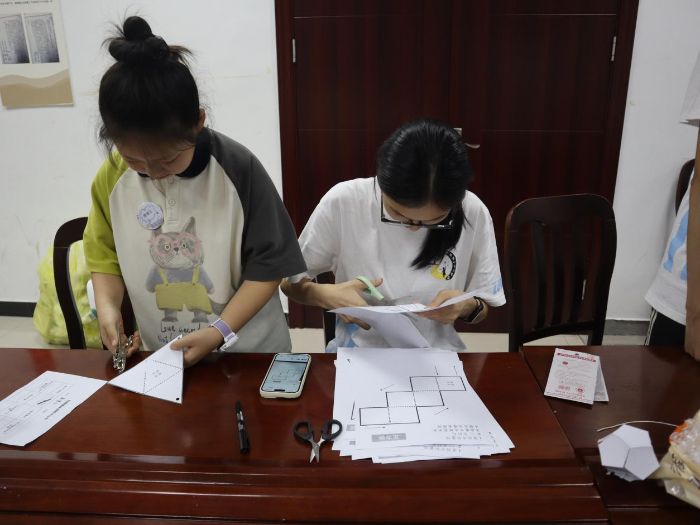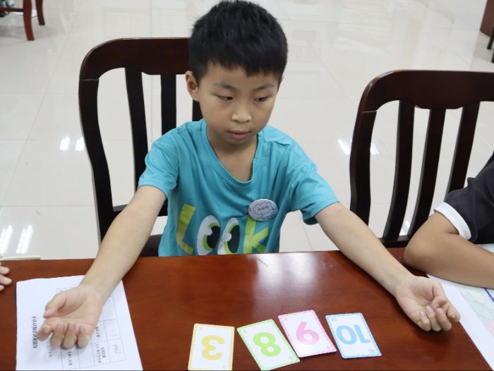 “牽引式立體幾何模型制作”現(xiàn)場(chǎng),孩子們熱情高漲。他們選取正方體、三棱錐等立體圖形的平面展開圖,在實(shí)踐隊(duì)隊(duì)員的指導(dǎo)下裁剪邊緣、打孔定位,再穿入細(xì)繩。這個(gè)神奇的過(guò)程,不僅培養(yǎng)了孩子們的專注力和動(dòng)手能力,更讓他們?cè)谕嬷欣斫饬丝臻g幾何的奧秘。“24點(diǎn)速算大比拼”更是將課堂氛圍推向高潮。小老師們隨機(jī)抽取4張數(shù)字牌,孩子們進(jìn)入“頭腦風(fēng)暴”模式,需在1分鐘內(nèi)通過(guò)四則運(yùn)算組合成24。游戲結(jié)束后,許多孩子們?nèi)砸猹q未盡,主動(dòng)探討不同組合方式,展現(xiàn)出了對(duì)數(shù)學(xué)的濃厚興趣和求知欲望。
