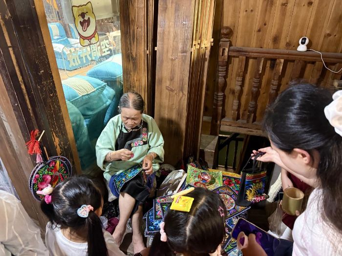 作為鳳凰古城最核心的IP,"邊城"依托沈從文故居構建出"象牙塔"般的世外桃源。穿城而過的沱江、錯落有致的街巷與吊腳樓群,共同勾勒出恬淡的湘西畫卷。其中,"湘見沱江"主題游船成為現象級爆款項目,通過兩岸燈光秀投影湘西百年故事,吸引中外游客紛紛點贊。苗繡攤位前,阿婆展開繡片,指著紋樣中的山川湖海意象介紹,“苗族兒女的針腳里,每一針都是故事。”200米外的蠟染傳習所內,師傅正指導研學團隊體驗非遺技藝。"這幾年研學體驗需求激增,其他地方都沒有蠟染的,這是我們的特色。"她笑著說。編彩辮的阿婆一邊手里忙活著,一邊向調研團解讀文化寓意:“苗家女兒出嫁時,兄弟姐妹都要來給姑娘編彩辮,是情誼也是祝福,現在游客體驗彩辮,等于把我們的婚俗文化帶回家了。”