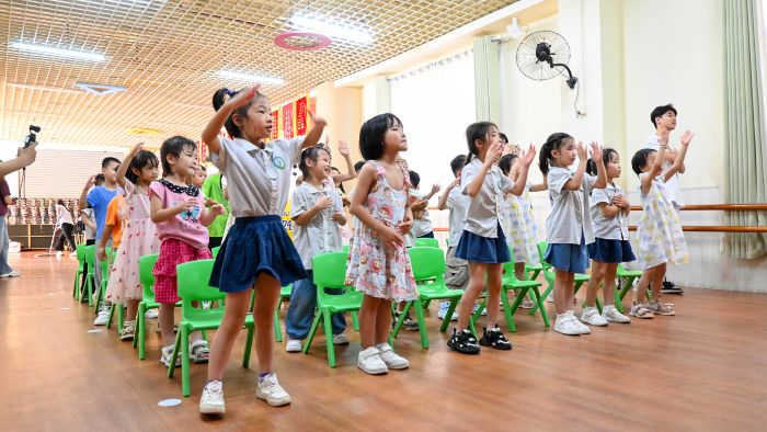 幼兒園小朋友們跟隨實(shí)踐隊(duì)成員學(xué)習(xí)交通安全操 陳靜雯攝