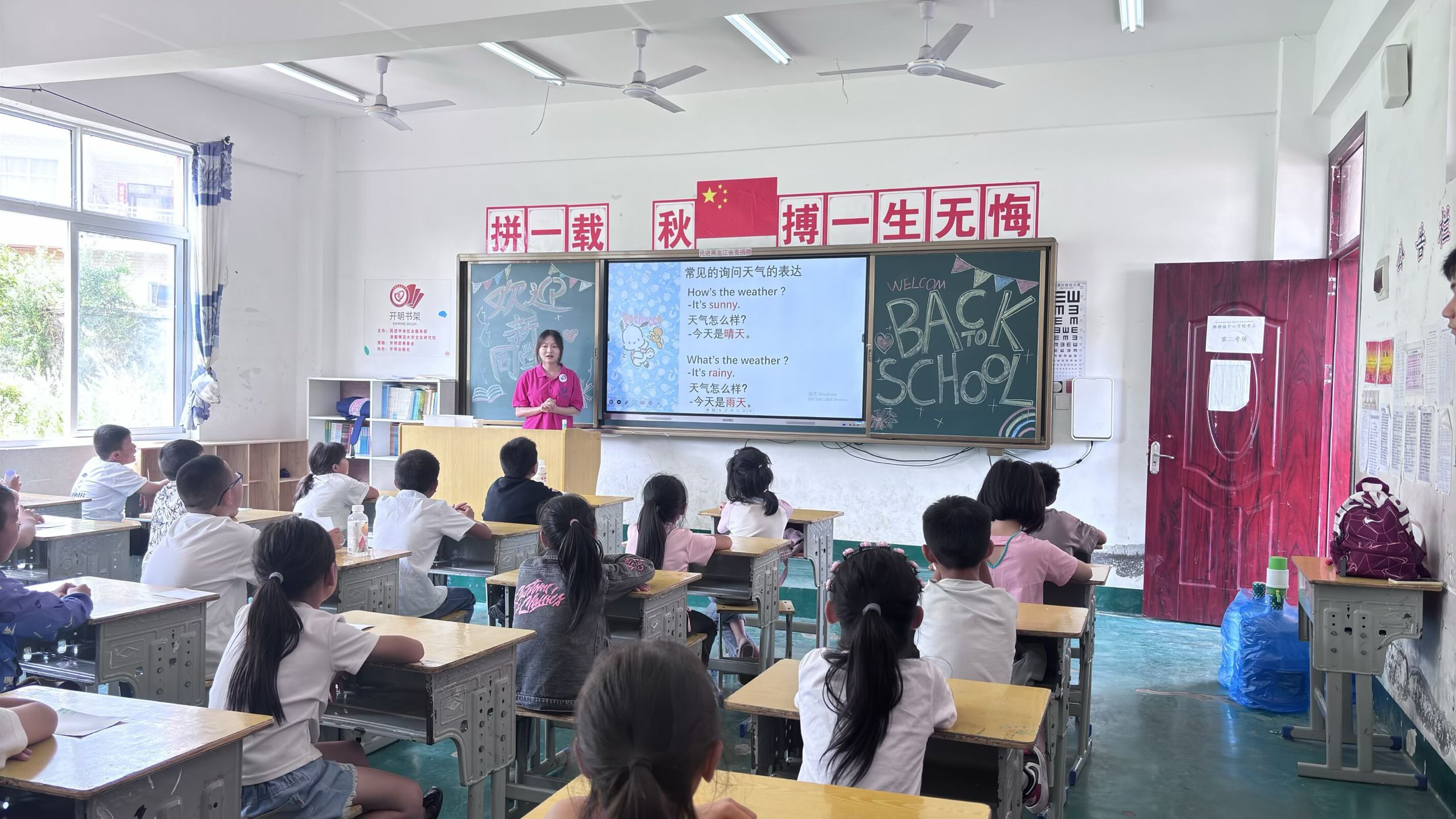 “天氣魔法歌會——《How's the Weather》”課程別開生面。課堂上,兩位老師播放精心挑選的英文兒歌視頻,生動的動畫畫面與歡快的旋律瞬間抓住學生的注意力。老師們還設計了角色扮演環節,讓學生分別扮演不同天氣的角色,用英語介紹自己代表的天氣特點。在熱烈的互動中,學生們不僅學會了晴(sunny)、雨(rainy)、多云(cloudy)等天氣詞匯,還能用簡單的英語句子描述天氣,英語表達能力得到了有效鍛煉。