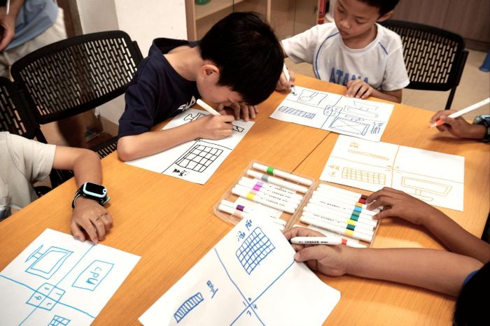 需求分析啟思維 童筆繪就設計圖 緊接著,"用戶畫像涂鴉"游戲點燃了小朋友們的熱情。"它是長方形的,黑色外殼,有很多按鍵..."第一組的小朋友正仔細描述著鍵盤特征,其他組的小朋友們迅速在畫紙上勾勒。這種"需求描述-協作繪畫-成果競猜"的創新形式,生動模擬了軟件開發中的需求分析過程。通過親身體驗,小朋友們直觀理解了在開始編程前明確目標、精準描述需求的重要性,進一步啟蒙了他們的邏輯思維與溝通協作能力。"原來編程前要先想清楚要做什么!"參與活動的小朋友們感嘆道。
