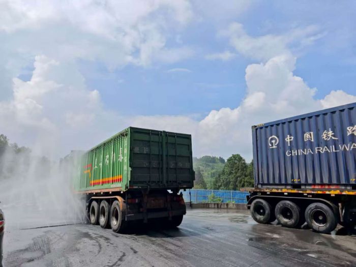 為進一步加強環(huán)境保護,降低煤礦運輸過程中的揚塵污染,廠房出口設了一道水沖洗防塵減塵工序,每當滿載煤炭的車輛從廠房駛出,便會緩緩經過這道水沖洗裝置,噴水孔對車輛進行全面沖洗,有效去除車身及輪胎上附著的煤塵,這一舉措不僅大幅減少了運輸車輛行駛過程中產生的揚塵,還顯著改善了礦區(qū)及周邊環(huán)境質量。