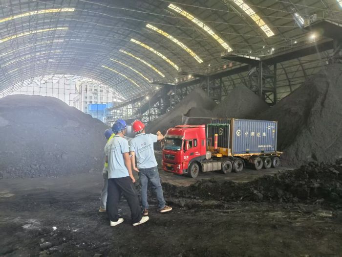 來到儲煤倉,隊員們正確佩戴安全帽后,在工作人員帶領下進入儲煤倉。堆積如山的煤炭仿佛一座黑色的寶藏,令人震撼,原煤如黑色的黑流般占據了大半空間,細密的煤粉在燈光下泛著金屬般的光澤,幾臺運輸車正緩緩穿梭其間。學生們沿著安全通道行走,感受著原煤堆積的規(guī)模,有隊員伸手捻起一點煤末,觀察其細膩程度。