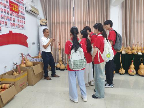 在傳承人顧秀國的工作室和展覽室中,隊員們觀察到葫蘆烙畫上的內容不僅有傳統(tǒng)的花鳥魚蟲,還有新潮的動畫人物,比如電影《魔童降世》中的哪吒,還有近期火爆的玩偶labubu。傳承人顧秀國表示,葫蘆烙畫的內容在傳承古畫的同時,也會實時關注社會動向與需求,為購買者提供個人定制服務,讓非遺技藝在傳承的基礎上更好的與社會融合。葫蘆烙畫的形式也是多種多樣的。既有純葫蘆烙畫,也有彩色畫,雕刻畫,還有精美的掐絲工藝,漆面葫蘆畫。在介紹展覽室里的葫蘆烙畫作品時,大家觀察到有幾個大葫蘆形狀“崎嶇”,有一個葫蘆柄上自然的打著一個結,或者兩個葫蘆一起打結,甚至還有三個一起的。傳承人顧秀國解釋道,這些特殊的葫蘆形狀是在葫蘆小的時候人為塑形的。他還分享了一個要去的知識,葫蘆塑型一定要在下午,下午時葫蘆是軟的,才方便塑形,但如果是上午,那是葫蘆是脆的,一掰就斷了。說到這些細節(jié)時,傳承人顧秀國口若懸河,對制作葫蘆烙畫的過程如數(shù)家珍,神采奕奕的向大家介紹,時不時望向窗外的葫蘆地,眼神中滿滿是對葫蘆的驕傲。