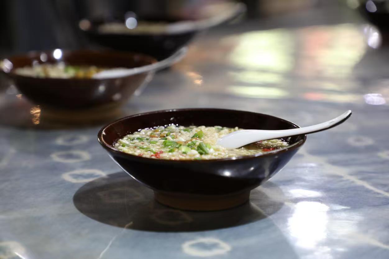 這碗看似樸素的熱湯,卻蘊含著煎、炒、熬等十余道復雜工序。祖輩傳下的火候把控、工序節奏,讓他家的油茶風味獨具一格。搭配的飯豆、紅苕、玉米等本地食材,更是讓油茶充滿了鄉土氣息。經過半小時的烹制,一碗充滿地方特色的熱湯——油茶便端上了桌,隊員們早已按捺不住激動之情,紛紛圍攏過來品嘗這份獨特的美食。