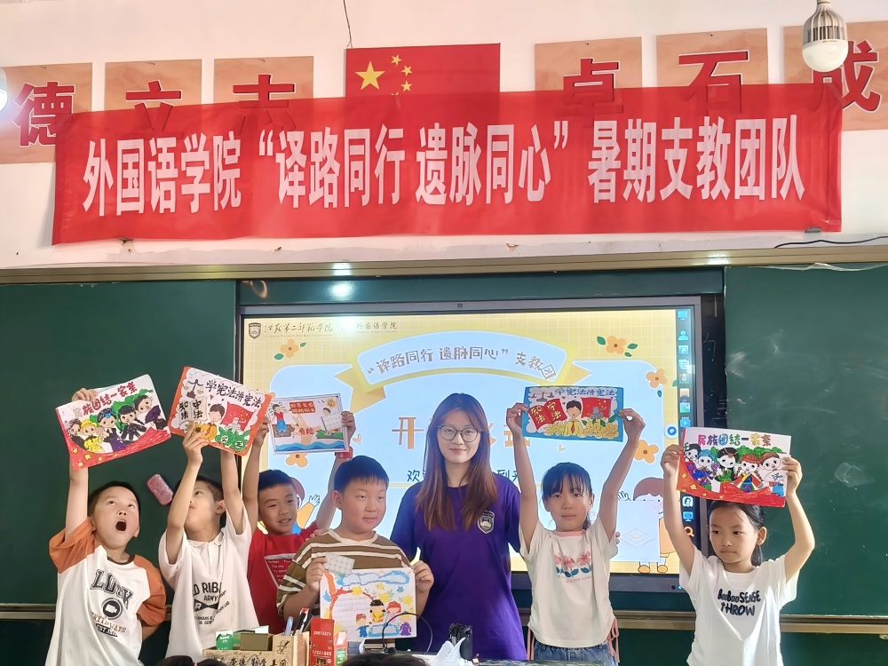 “譯路同行 遺脈同心”支教團積極響應時代號召,緊扣“民族團結+非遺傳承+英語賦能”主線,深度融合專業特色與民族文化底蘊,在貴州“鑄牢中華民族共同體意識模范省”的土壤,定點幫扶貴州省鎮寧布依族苗族自治縣實驗小學,以雙語非遺課程開發、紅色文化沉浸教學、民族技藝創新傳播等實踐路徑,形成“課堂教學+素質拓展+心理輔導”的立體化幫扶,為少數民族地區教育與文化發展注入青春活力,助力民族團結和文化幫扶教育。