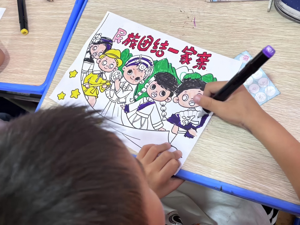 為鞏固學習成果,支教團隊組織小朋友們制作手抄報。孩子們圍繞“民族團結”和“法治宣傳教育”兩大主題,發揮創意,用彩筆描繪出心中的法治與團結。一幅幅色彩斑斕的手抄報,展現了孩子們對知識的理解和對美好未來的憧憬。