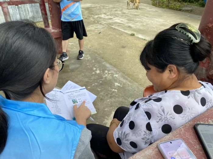 “爺爺您看,這頁‘超市購物’里寫著‘請問這個(gè)多少錢’,跟我讀——請、問、這、個(gè)、多、少、錢。”實(shí)踐團(tuán)隊(duì)員站在68歲的韋爺爺身邊,指著手冊上的注音文字慢慢領(lǐng)讀。韋爺爺戴上老花鏡,手指跟著字音在紙面滑動(dòng),偶爾用方言詢問含義,實(shí)踐團(tuán)隊(duì)員便耐心用桂柳話和壯話解釋,再反復(fù)示范發(fā)音。同時(shí),實(shí)踐團(tuán)也對當(dāng)?shù)貕言挕⒎窖赃M(jìn)行對話錄音,做到推廣與保護(hù)并行。