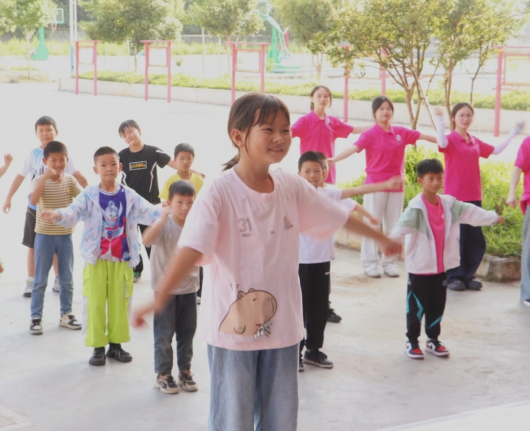 清晨,支教團隊組織孩子們以活力晨操喚醒校園,孩子們伸展躍動的身影匯成朝氣蓬勃的晨光。課堂教學中,禁毒知識宣講與趣味英語課程巧妙融合互動游戲,點燃求知熱情;課間繽紛的文體活動更讓歡笑聲漫溢校園,青春能量恣意綻放。