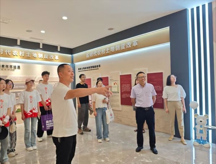 步入莊重的農村土地改革陳列館,時光仿佛在此凝結。在上苓村黨委書記、村委會主任王明軍的生動講述中,隊員們開啟了一場跨越時空的深度“對話”。泛黃的舊報、珍貴的文獻、承載歲月的紀念冊……每一件展品都無聲訴說著金魚鎮那段敢為人先的崢嶸歲月——從突破集體統一耕作模式,首創“分組作業、定產定工”,到逐步探索包產到組、包產到戶的實踐足跡,每一步都鐫刻著改革者的勇氣與智慧。王書記強調,這里不僅是一部土地改革的“立體檔案”,更是傳承紅色基因、滋養初心使命的鮮活課堂。正是當年的“包產到組”等開創性實踐,為今日鄉村振興奠定了堅實的制度基石,積淀了寶貴的精神財富,其探索為波瀾壯闊的農村改革提供了彌足珍貴的“廣漢經驗”。隊員們駐足凝思,在歷史的回響中深切感悟改革初心與使命擔當。