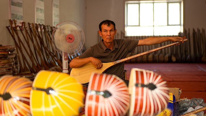 圖為新和縣依其艾日克鄉(xiāng)音樂(lè)器農(nóng)民專業(yè)合作社調(diào)琴師正在為新制作的“都塔爾”調(diào)音。陳嘉楠攝