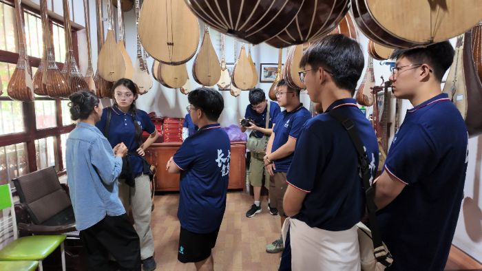 團(tuán)隊(duì)成員在國(guó)家非遺傳承人艾依提·依明(已故)工作室參觀,圖為艾依提之女熱汗古麗為團(tuán)隊(duì)成員講解傳統(tǒng)民族樂(lè)器“都塔爾”及“彈撥爾”的歷史。湯皓添攝