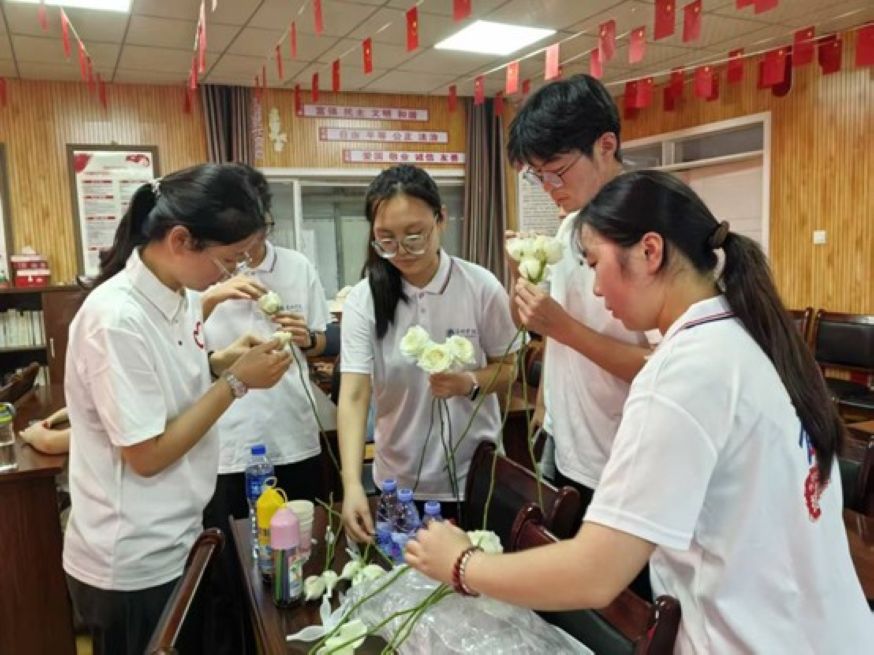 孩子們將白色康乃馨的莖部剪成不同長度,放入裝有紅、藍、黃等食用色素水的杯子中。隨著時間推移,潔白的花瓣漸漸暈染出繽紛色彩,神奇的變化讓孩子們驚嘆連連。。團隊成員借此引導孩子們觀察現象、思考原理,激發他們對科學探索的興趣。