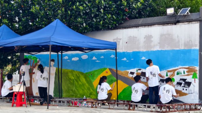 工作過程中,團隊成員不時交流色彩搭配技巧,“這里的樹冠用深綠加深邊緣會更立體”“那片田野的黃色再加點橙,會更有豐收的感覺”。陽光熱情地灑在大家忙碌的身影上,汗水順著專注的臉頰滑落,浸濕了印有青行團隊標識的白色T恤,可成員們的眼神依舊明亮,笑容在陽光下愈發燦爛。