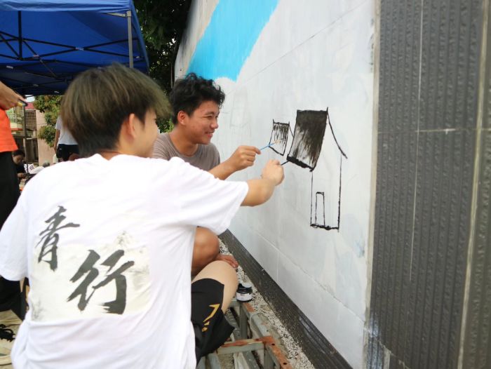 圖為“青行”實踐團成員按分工完成墻繪。鄭鎧泓供圖
