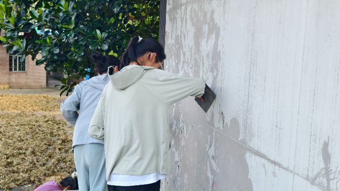 下午,成員們用村民熱心提供的工具仔細刮掉舊墻繪,確保新墻繪的基底平整、干凈。接著手持滾筒涂刷白色顏料,覆蓋難以刮除的殘留痕跡。經過一下午的努力,墻面煥然一新,為后續墻繪工作打下了堅實基礎。