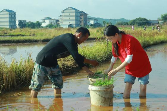 為深刻體悟中華農(nóng)耕文明的深厚底蘊(yùn),充分發(fā)揮思政實(shí)踐育人的磅礴力量,7月14日,江西農(nóng)業(yè)大學(xué)馬克思主義學(xué)院趙美嵐老師帶領(lǐng)“星火耕耘”實(shí)踐隊(duì)走進(jìn)江西省吉安市峽江縣金坪民族鄉(xiāng)南下村。在黨的二十大代表、全國(guó)三八紅旗手標(biāo)兵、南下村黨支部副書記石玉蓮的指導(dǎo)下,師生們于優(yōu)質(zhì)水稻專業(yè)合作社的稻田中開展了一堂“接地氣、冒熱氣、聚人氣”的農(nóng)耕“大思政課”,通過勞作實(shí)踐、技術(shù)觀摩與深度對(duì)話,將農(nóng)耕文化傳承、鄉(xiāng)村產(chǎn)業(yè)振興與青年使命擔(dān)當(dāng)融入泥土芬芳。