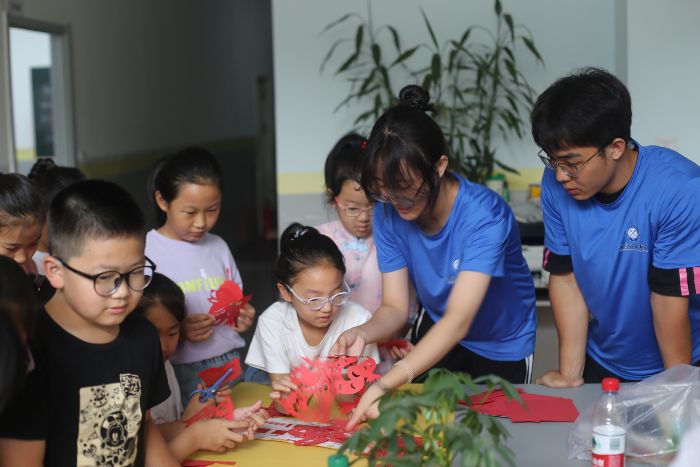 圖為隊(duì)員帶領(lǐng)小朋友們學(xué)習(xí)剪紙。顏斯睿 供圖