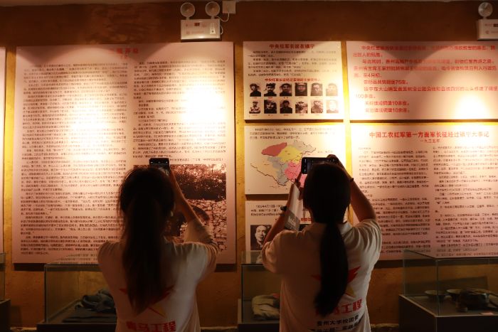 “看到這些銹跡斑斑的軍用水壺、磨損嚴(yán)重的草鞋,仿佛看到了紅軍戰(zhàn)士不畏艱險、英勇奮斗的身影。”實踐隊隊員楊世英感慨道。陳列館內(nèi),收藏著《紅軍長征在安順》、《瀑鄉(xiāng)鎮(zhèn)寧的紅色注事》、《紅軍長征過鎮(zhèn)寧史實》等紅色主題書籍,墻壁上的一幅幅歷史畫卷讓隊員們深刻體會到革命先輩的堅定信念和犧牲精神。