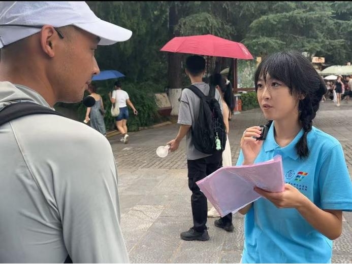 游客互動:傳遞古建力學科學價值 7月12日,實踐團成員們積極與明孝陵的游客進行訪談交流,內容涵蓋明孝陵的歷史文化背景和建筑結構特點。團隊成員們運用通俗易懂的語言,在訪談的過程中向游客們介紹明孝陵建筑中的力學知識,從石材的承重原理到拱券結構的分力機制,從建筑群的抗震設計到排水系統的流體力學應用,都被生動地呈現出來。 許多游客表示,通過河海學子的專業講解,他們不僅了解了明孝陵的歷史價值,更深刻認識到古建筑中蘊含的科學智慧。