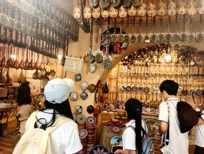 團隊成員在工作人員帶領下深入大巴扎街區,對各類非遺項目進行實地走訪調研,近距離接觸了艾德萊絲綢、喀什銀器及手工皮雕等多項非遺技藝。期間,新疆非物質文化遺產剪紙技藝傳承人王革老師向團隊成員們介紹了新疆剪紙藝術的發展歷程,并分享了自己多年來從事剪紙非遺傳承工作的心得體會。