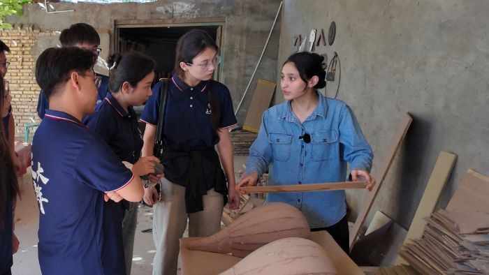 圖為熱汗古麗在艾依提的工作室為隊員們講解樂器制作過程 陳嘉楠供圖