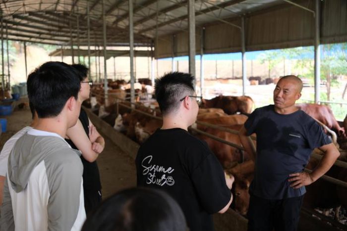 圖為實(shí)踐團(tuán)成員與養(yǎng)牛基地負(fù)責(zé)人探討問題