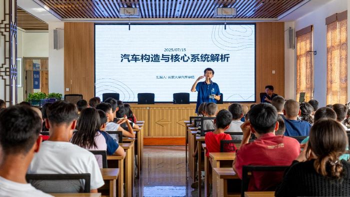 課堂上,隊員們轉變為小老師,利用汽車部件模型及專業課件,帶領當地學生們開啟了一場奇妙的“汽車探秘”之旅。實踐隊員從汽車的發動機講起,圍繞汽車的動力系統、傳動系統以及制動系統等內容展開講解。隊員們用形象的比喻和通俗的表達,將復雜的原理轉化為孩子們聽得懂、記得住的知識點,探索的熱情在互動中不斷升溫,一顆顆對機械世界好奇的“種子”也悄然萌發。