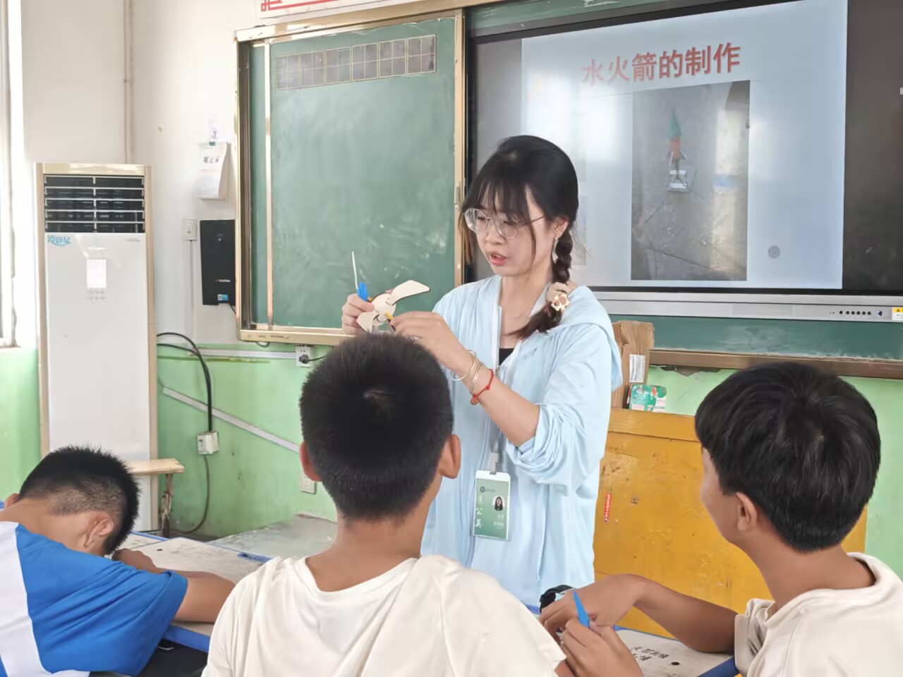 為激發孩子們對科學技術的興趣,支教團成員將水火箭制作引入課堂,為孩子們帶來一場充滿趣味與挑戰的科技盛宴。活動開始,支教團成員用通俗易懂的語言向孩子們講解水火箭的構造、發射原理,如牛頓第三定律,讓孩子們明白水火箭如何利用氣壓和水的反作用力實現升空。隨后,老師們現場演示制作過程,如何用塑料瓶瓶制作動力艙、箭體,如何安裝尾翼、箭頭,以及如何調試發射角度。