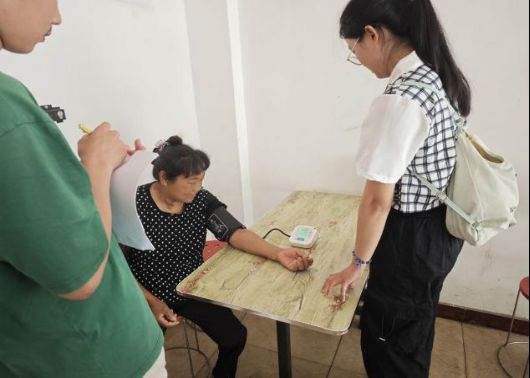 7月8日,團隊深入各村開展入戶走訪,踩著田埂走進村民家中。隊員們一邊幫老人測血壓、記錄數據,一邊遞上問卷,在“今年收成怎么樣”“看病方便不”的家常閑聊里,聽村民講生活變化、說實際需求。從院落里的農具擺設到屋檐下的家長里短,調研在煙火氣中悄然深入,讓實踐腳步扎實踩在鄉土上,也于細微處讀懂民生百態。