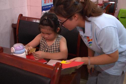 (圖為實踐團成員指導小朋友制作國旗照片。程坪攝)