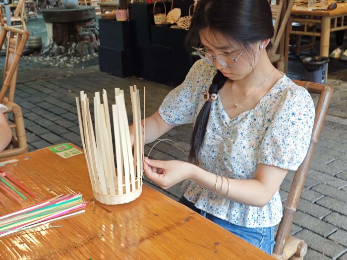圖為實踐隊隊員自己進行各項竹編作品的操作學(xué)習(xí)。羅嬌楊攝