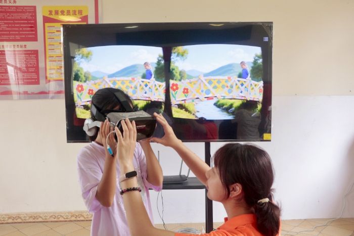 科技筑夢:紙橋里的家鄉未來 為了點燃孩子們心中更大的工程夢想,服務隊巧妙地運用科技讓冠軍組紙橋“走出”課堂。首先利用AI圖像生成工具,輸入冠軍組紙橋的關鍵結構特征和鄉村常見場景關鍵詞。冠軍組紙橋瞬間“化身”為溪流上的竹木小橋、連接田埂的堅實便橋。接著,服務隊將生成的圖片導入VR眼鏡里,當孩子們戴上VR眼鏡,他們看到小朋友腳下踩著的正是以他們冠軍紙橋為原型“建造”的鄉村小橋,他們可以“走”上橋面,低頭觀察橋下熟悉的加固結構如何支撐行人。這一刻,抽象的工程原理變成了可觸摸的家鄉未來圖景。