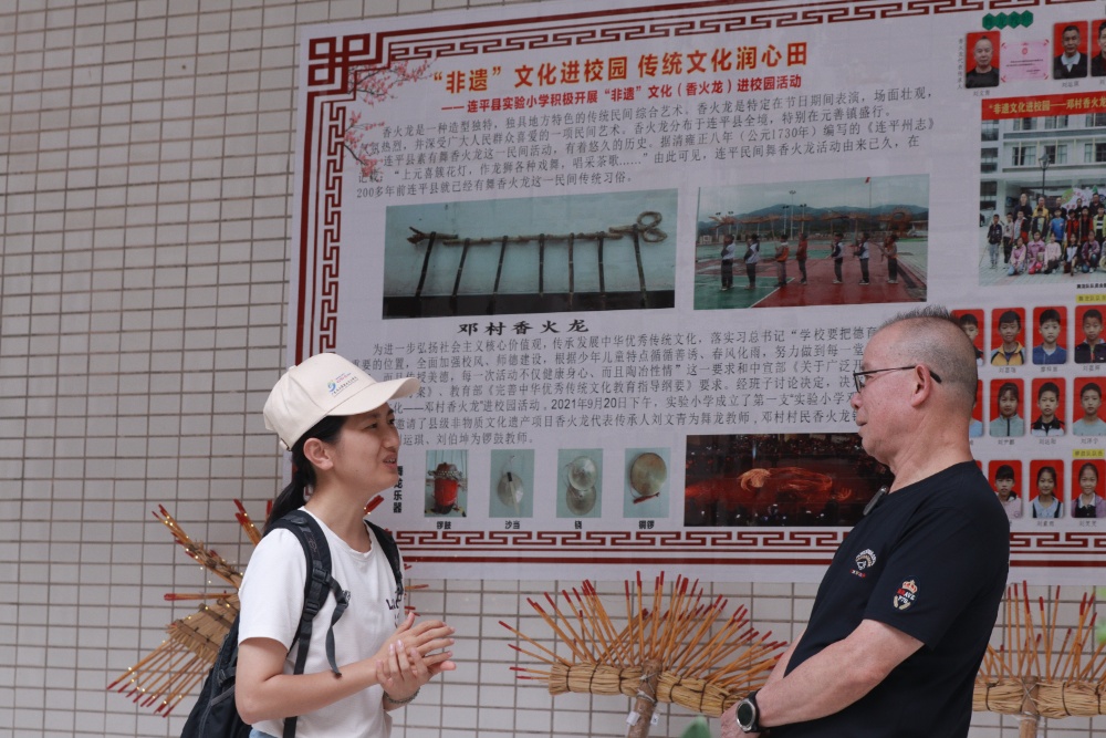 葉茵向香火龍非遺傳承人劉文青了解學校開展“非遺進校園”活動情況(攝:黃紀語)