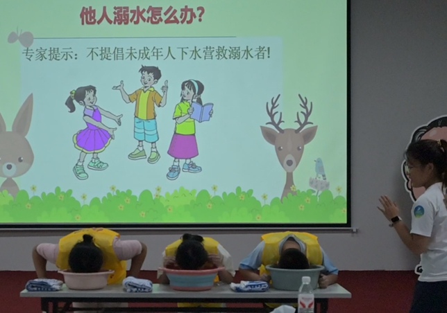 隨后,在確保安全的前提下,隊員邀請小朋友進行了憋氣挑戰。挑戰過程中,小朋友的憋氣時間在十秒到三十秒不等。在挑戰結束后,孩子們漲紅著臉喘氣時,隊員們適時介入并解釋:“這就是溺水者的感受,恐慌會加速體力消耗。” 通過這種體驗式教學,孩子們能夠更直觀地感受到溺水時的不適與危險,從而增強他們的安全意識和自我保護能力。