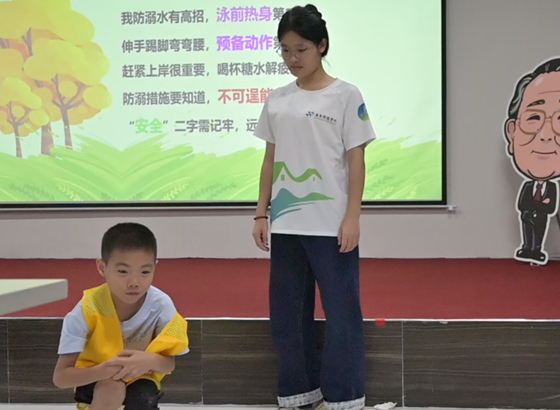 此外,隊員們不僅注重教授孩子們“他救”技能,更強調“自救”的重要性。在陸上溺水模擬環節,隊員們手把手指導孩子們練習“水母漂+仰漂”自救技巧,詳細講解并示范了“抱膝蜷縮—身體上浮—扭轉身體—伸展四肢—挺直腰部—雙手抱頭”的動作要領。孩子們在實踐中發現,通過這些簡單的動作,即使不使勁游泳,也能有效地讓自己浮在水面上,從而節省體力并等待救援。當孩子們完成練習后,他們眼中閃爍著成就感,紛紛表示這種自救方法既實用又有效。