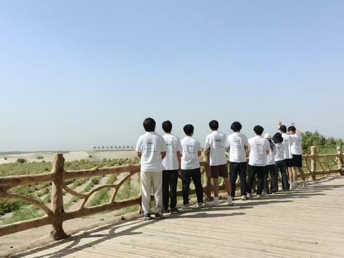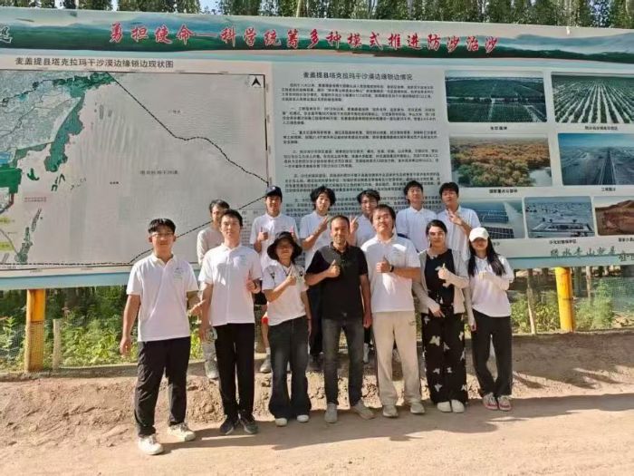 實踐團抵達麥蓋提縣后,在當地提供的專用交通保障下前往塔克拉瑪干沙漠邊緣觀測點。在這里,實踐團看到曾經飽受流沙侵蝕、嚴重威脅周邊生產生活空間的區域,經過長期治沙工程的持續推進,如今已構建起多層固沙林帶,展現出 “林進沙退” 的顯著成效,讓隊員們直觀感受到治沙工程的偉大力量。