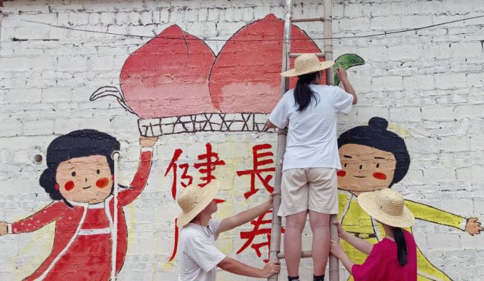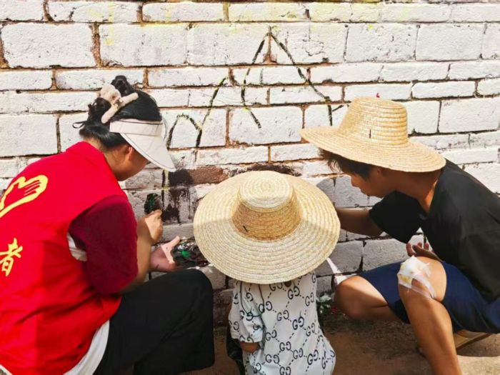 鏡頭下,志愿者結合協和村“長壽村”特色,選定長壽家風等主題進行墻繪。夏日酷熱中,隊員們清理墻面、涂漆調色,村民熱情支援,小朋友也參與其中,讓協和村村貌煥新。