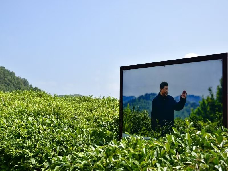 二、生態與產業共生:總書記囑托下的綠色發展實踐 "人不負青山,青山定不負人。"2020年習近平總書記考察蔣家坪村時的囑托,已成為當地發展的根本遵循。團隊來到女媧鳳凰茶業現代示范園進行調研、觀光,沿著茶園內的觀光步道前行,欣賞成片的茶樹在山坡上隨風搖曳的美景,感受茶園的生態魅力。