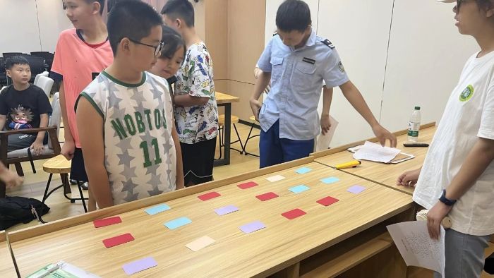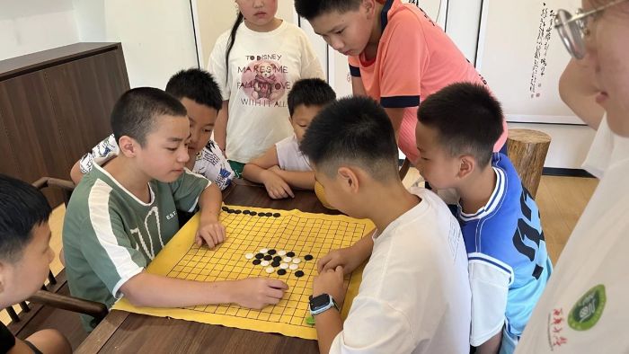 作業(yè)時(shí)間結(jié)束后,團(tuán)隊(duì)成員與部分小朋友圍坐成圈,以詩(shī)為媒,展開了一場(chǎng)妙趣橫生的文字較量——飛花令,考驗(yàn)孩子們古詩(shī)詞儲(chǔ)量的同時(shí),也在互動(dòng)中傳播了中華傳統(tǒng)文化的魅力,看到孩子們努力回想詩(shī)詞的模樣,成員們的成就感十足。從“意欲捕鳴蟬”到“映日荷花別樣紅”,詩(shī)詞接龍如溪水潺潺,孩子們的猶豫聲與成員們的小聲提醒交織成趣。屋外蟬鳴聲聲不息,屋內(nèi)孩童意猶未盡,這場(chǎng)詩(shī)詞互動(dòng)讓教室里充滿書香與童趣,也讓孩子們暢游詩(shī)詞的海洋,收獲知識(shí)與歡笑。除此之外,一部分孩子們則是聚在棋桌前,繼續(xù)前一日的五子棋對(duì)弈,成員們?cè)谂灾笇?dǎo)陣法,提供謀略,現(xiàn)場(chǎng)笑聲不斷。