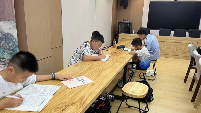18日上午8:40,孩子們陸陸續(xù)續(xù)來到教室,晨間鳥語,窗畔蟬鳴,伴隨著孩子們的歡笑聲,將活動(dòng)室襯托得格外有生機(jī),仿佛閉上眼就能在腦海中浮現(xiàn)夏日清新綠意。每日作業(yè)時(shí)間都從9:00正式開始,陽光穿透磨砂玻璃,傾灑在孩子們的書桌上,小老師們正俯身在孩子們身邊耐心監(jiān)督著,不時(shí)為小朋友解答難題,看著孩子們細(xì)致認(rèn)真的完成作業(yè),十分感慨。有的孩子手捧課外書,眉頭微蹙,一副沉浸于書中世界的樣子;有的則在練習(xí)本上一筆一劃書寫生字,力求工整。“以前在家寫作業(yè)總愛分心,在這里和小伙伴一起學(xué),還有老師隨時(shí)幫忙,感覺效率高多啦!”剛完成英語練字的小朋友舉著本子向老師展示,臉上展開笑顏。這段專注的學(xué)習(xí)時(shí)光,不僅讓孩子們?cè)谳p松氛圍中逐步推進(jìn)暑期作業(yè)任務(wù),更在老師的陪伴下,一點(diǎn)點(diǎn)播種下自主學(xué)習(xí)的種子。