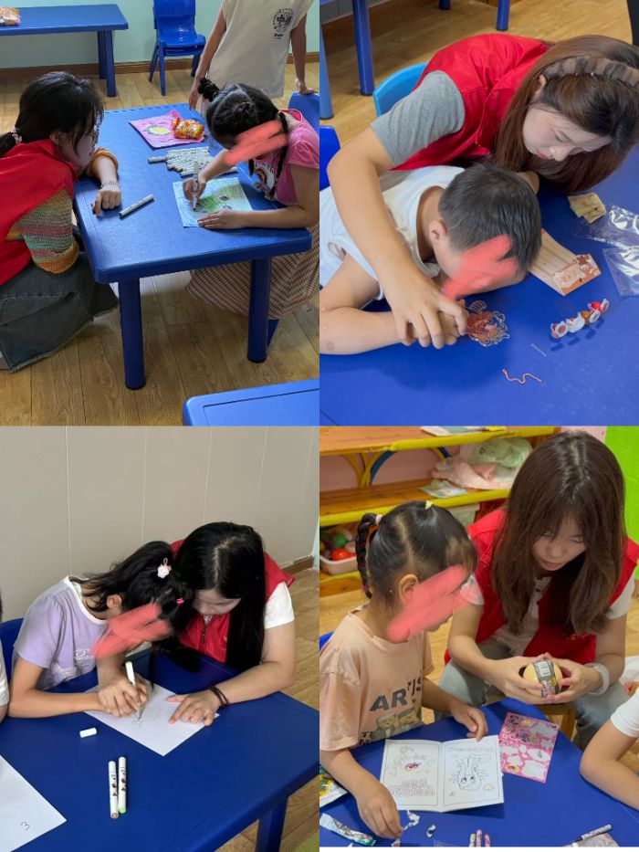 活動中,大學生們化身“多面手”,從康復輔助到心理陪伴,從創(chuàng)意教育到藝術療愈,用多元方式助力孩子們成長。在康復輔助訓練中,他們通過游戲、兒歌、故事等童趣滿滿的形式,激發(fā)孩子們的語言表達欲,還主動分擔老師的工作,悉心照看每一個孩子;“社交小團體”課程里,4-6名兒童一組,合作繪畫、玩團體游戲,在互動中悄悄培養(yǎng)起輪流、分享等社交技能;藝術表達課程上,自由繪畫讓孩子們用色彩抒發(fā)情緒,音樂療愈小組則借助節(jié)奏訓練和音樂游戲,幫助他們提升注意力與社會互動能力。此次實踐活動的創(chuàng)新性在于,它打破了傳統(tǒng)單一陪伴的模式,以“康復+心理+藝術”多維度介入,按“基礎能力→情緒調節(jié)→社會適應”三階段推進,還采用“大學生+康復師”協(xié)作模式,每位隊員固定陪伴1-2名兒童,讓關愛更精準、更有效。