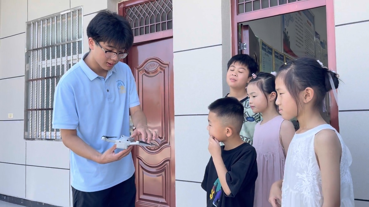 圖為實(shí)踐團(tuán)成員與孩子們介紹無(wú)人機(jī)的基本原理。