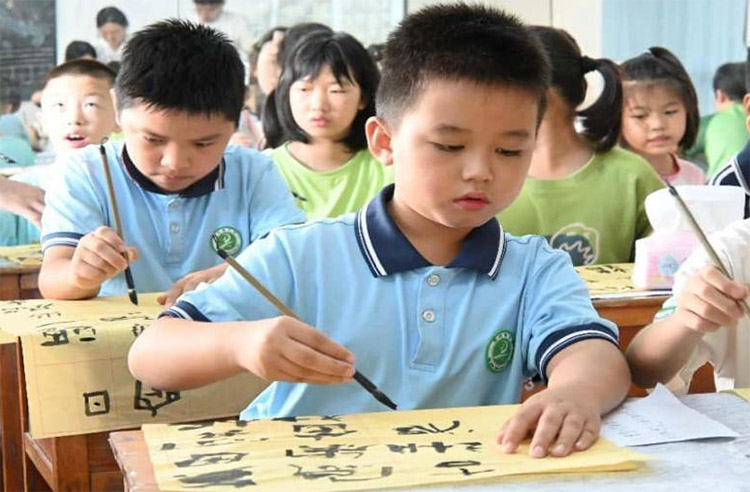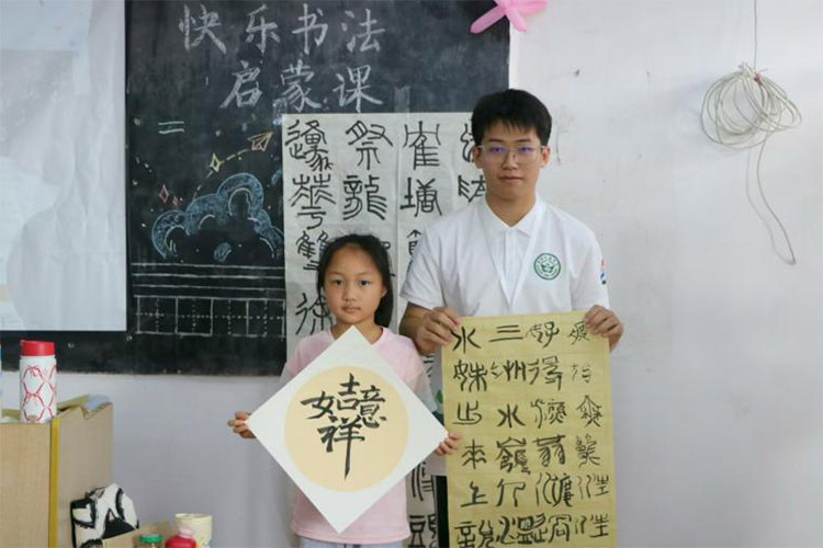 隊員葉子老師(化名)生動地講解:“寫‘浪’字時,捺畫要像波浪一樣起伏;寫‘竹’字時,豎畫要像竹子般挺拔。”孩子們專注臨摹,體會著“字如其歌”的美感。課后,看著自己完成的作品,他們天真又認真地說:“老師說字里有歌,我要讓畫里有水,這樣歌就不會干了。”這份童真的理解,讓隊員們倍感欣慰。