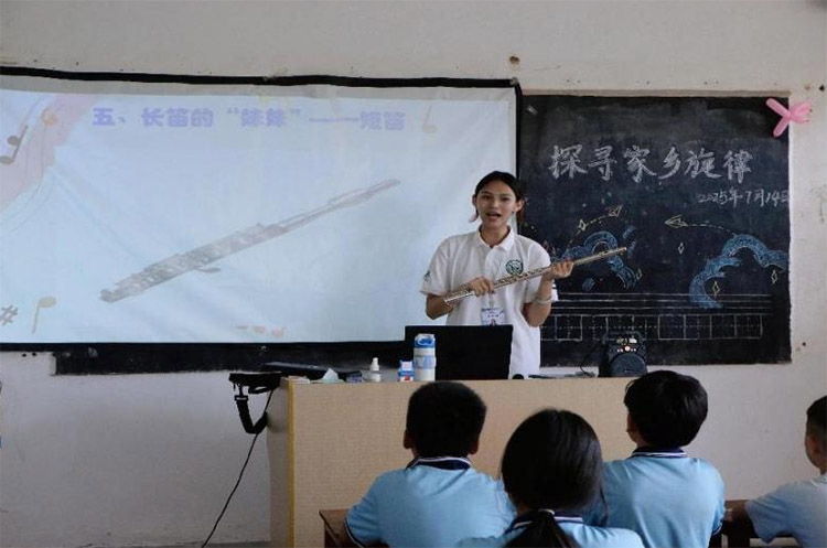 東江水路歌,承載著東江流域客家人對自然的敬畏與生活的熱愛,是當地獨特的非遺瑰寶。但其古老的曲調和方言歌詞,對孩子們而言頗有距離感。隊員們提前做足功課,向當地傳承人虛心請教唱腔技巧,將晦澀的歌詞細心標注拼音和釋義,并創新地引入長笛進行伴奏教學,大大降低了學習門檻。