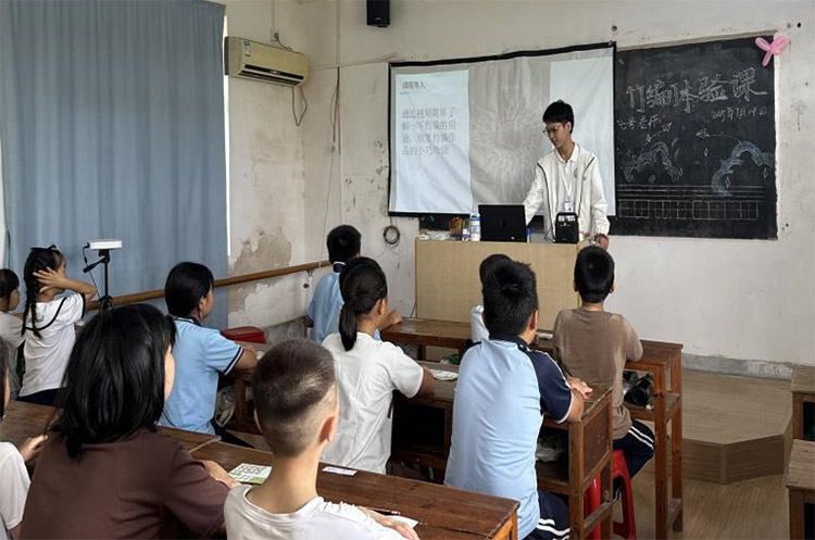7月9日清晨,帶著精心準備的教材和非遺手工工具,隊員們踏入了留洞村。駐村第一書記朱驍競同志熱情迎接了大家,他感慨道:“村里的孩子們暑假大多跟著老人,要么是放養狀態,要么就抱著手機。你們能來教知識、傳手藝,這真是件大好事,影響會很深遠!”這份沉甸甸的期望,更堅定了隊員們的決心。活動籌備階段,團隊就與村委會、當地非遺傳承人進行了多次深入溝通,精準對接村內需求,最終設計出“基礎課程+特色非遺”的課程體系。客家山歌《走遍江南古竹好》的學唱、竹編扇子的動手制作、東江水路歌歌詞的書法教學……這些特色活動巧妙地將非遺融入日常課堂,讓傳承變得觸手可及。